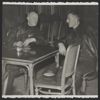 Foto in zwart-wit van twee mannen in leren jassen aan tafel, afgedrukt in Nieuw Spoor nummer 4 op pagina 12 bij een artikel. Op de stoel ligt een pet van de Nederlandse Spoorwegen. Achter de mannen zijn stoelen opgestapeld. Achterop de foto gegevens over de foto.