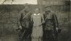 Groepsportret van twee Nederlandse militairen in leren jassen van Huzaren-Motorrijder met jonge vrouw voor lage muur. tekst achterop: "Mobilisatie april 1940"