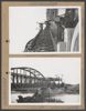 Een op bruin papier geplakte foto in zwart wit van de brug bij Zutphen. De brug bestaat uit een boogbrug en een platte brug, zowel voor verkeer als voor treinverkeer. Een boot nadert. Op de kade liggen materialen. Onder de foto is met een zwarte pen 'Opbouw brug Zutphen' en een gedeeltelijk leesbaar nummer geschreven.