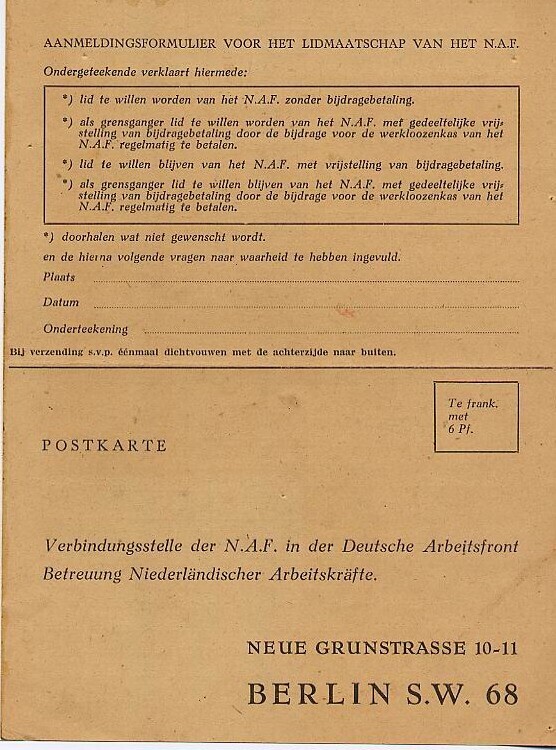 aan het Nederlandsche Arbeidsfront Landsmeer 21 augustus 1942. " brief van Dhr Avis aan het Arbeidsfront betreffende aansluiting bij het Front "Het Nederlandsche Arbeidsfront (NAF) was een nationaalsocialistische vakcentrale die op 30 april 1942 per verordening door Seyss-Inquart werd opgericht.