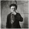 Borststuk van jongetje met pet, staand voor een muur. Hij eet een broodje en zijn trui heeft in het midden een groot gat.