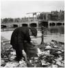 Voorover gebogen man ten voeten uit met pet op, zoekend naar bruikbare waar tussen vuilnis. Op de achtergrond is de Magere Brug te zien.