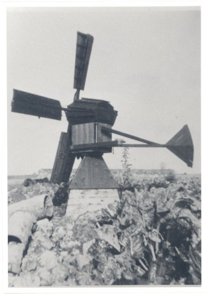 Ouwerkerk. Molenweg. De molen, met rechts de woning van de molenaar, toen Jan Kodde. De opname is van na de oorlog: de begroeiing om de woning is door de inundatie verdwenen. Op de achtergrond Capelle