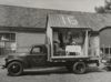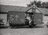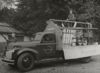 Zwart-wit foto van de bevrijdingsoptocht in Zeist. In de optocht rijdt een vrachtwagen van de Algemene Transport Onderneming (ATO) mee. Naast de vrachtwagen staat een man met een geweer. Op de vrachtwagen is een opbouw gemaakt met goederen erin. Aan de voorkant van de opbouw staat 'Van Gend en Loos'. Aan de zijkant van de vrachtwagen staat 'Deutsche Reichsbahn'. Bovenop de goederen zit een man. Er ...