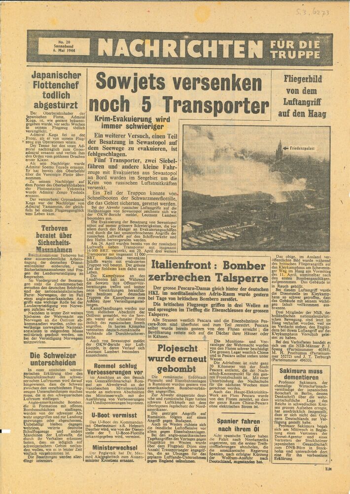 Nachrichten für die Truppe, nr. 20 Sonnabend - 6. Mai 1944 (T.20)* Japanischer Flottenchef tödlich abgesturtz.* Sowjets versenken noch 5 Transporter.* Fliegerbild von dem luftangrif auf Den Haag.* Terboven beratet über Sicherheit-Massnamen.* Italienfront : Bomber zerbrechen Talsperre.* Die Schweitzer Unterscheiden.* Rommel schlug Verbesserungen vor.* Plojescht wurde erneut gebombt.* U-Boot vermist.* ...