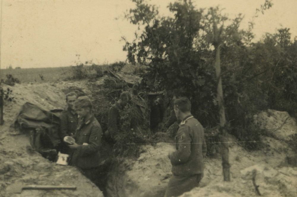 Afbeelding in zwart-wit met als voorstelling een groep mensen die zich verzameld hebben in de pas gegraven loopgraaf voor HGB III. Op de achterzijde in paars een gedeelte van een stempel dat verraadt dat de foto groter was maar afgeknipt is. slechte het negatiefnummer is nog te zien: '13332 - lid v.d. Ned. ver. v. Persofotografen'. Links een datumstempel: '9 oct 1939'. Er heeft een papier op de foto ...
