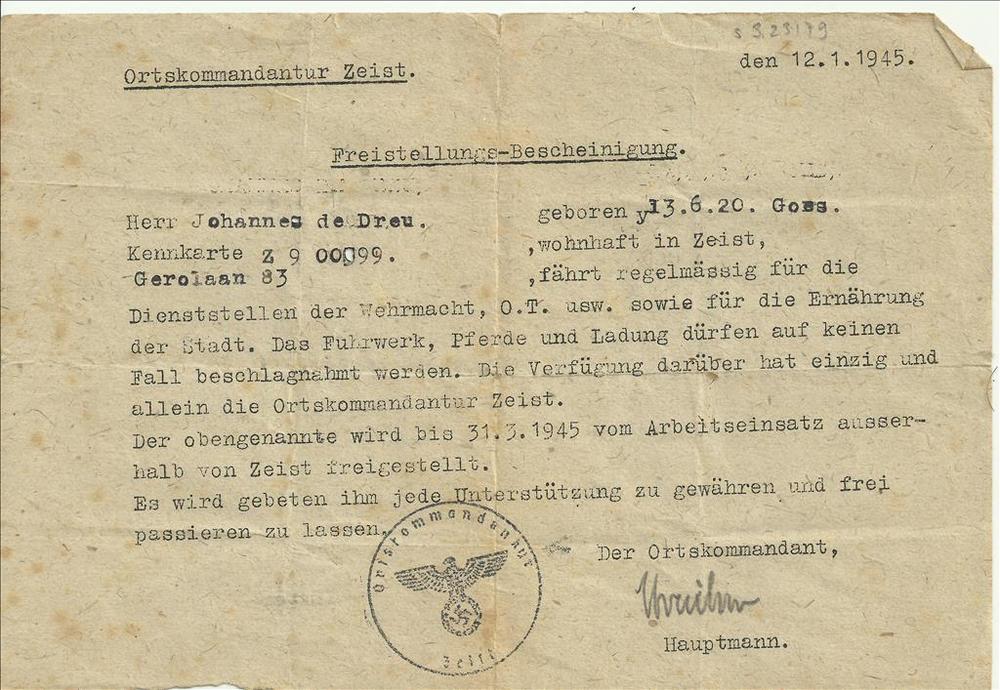Verklaring van de Ortskmmandantur te Zeist, 12 januari 1945.Voor dhr. J. de Dreu, wegens arbeid voor het Nederlandse Rode Kruis mag zijn paard en wagen niet gevorderd worden door de Wehrmacht en is hij vrijgesteld van arbeidsinzet.