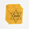 Jodenster. Nederland. Ongedragen. Zwarte jodenster op gele stof met centraal geplaatst het woord 'Jood', daarmee aanduidend dat dit een Nederlandse ster is. Bijzonder is het dat deze ster niet is uitgeknipt. De ster is gedrukt op een vierkant stukje stof met om de contouren van de ster een stippellijn gedrukt. Op deze stippellijn zou de ster dus uitgeknipt moeten worden alvorens op een kledingstuk ...