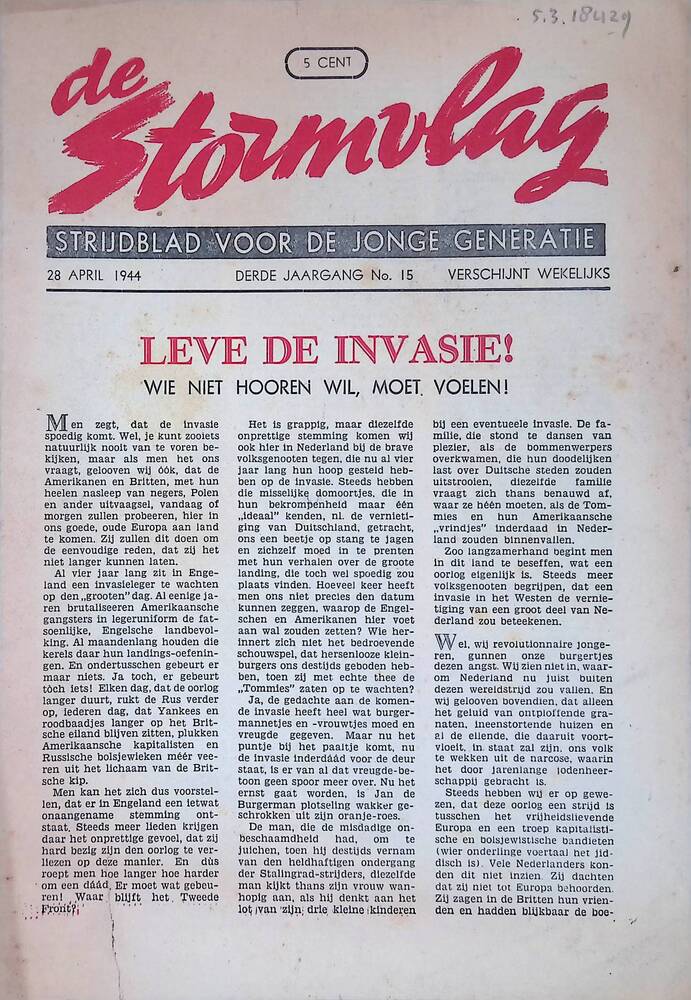 De Stormvlag. Strijdblad voor de jonge generatie, derde jaargang, no. 15, 28 april 1944.Leve de invasie, wie niet horen wil ,moet voelen. NJS (Jeugdstorm) 'de Stormvlag' krant. De NJS was een Nederlandse jeugdbeweging voor en tijdens de Tweede Wereldoorlog, geïnspireerd door de Duitse Hitlerjugender. De organisatie was formeel gescheiden, maar had in de praktijk nauwe banden met de NSB. De 'Stormvlag' ...