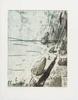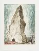 Semi abstracte kleurenets met als voorstelling een groot rotsblok en een spoorlijn.