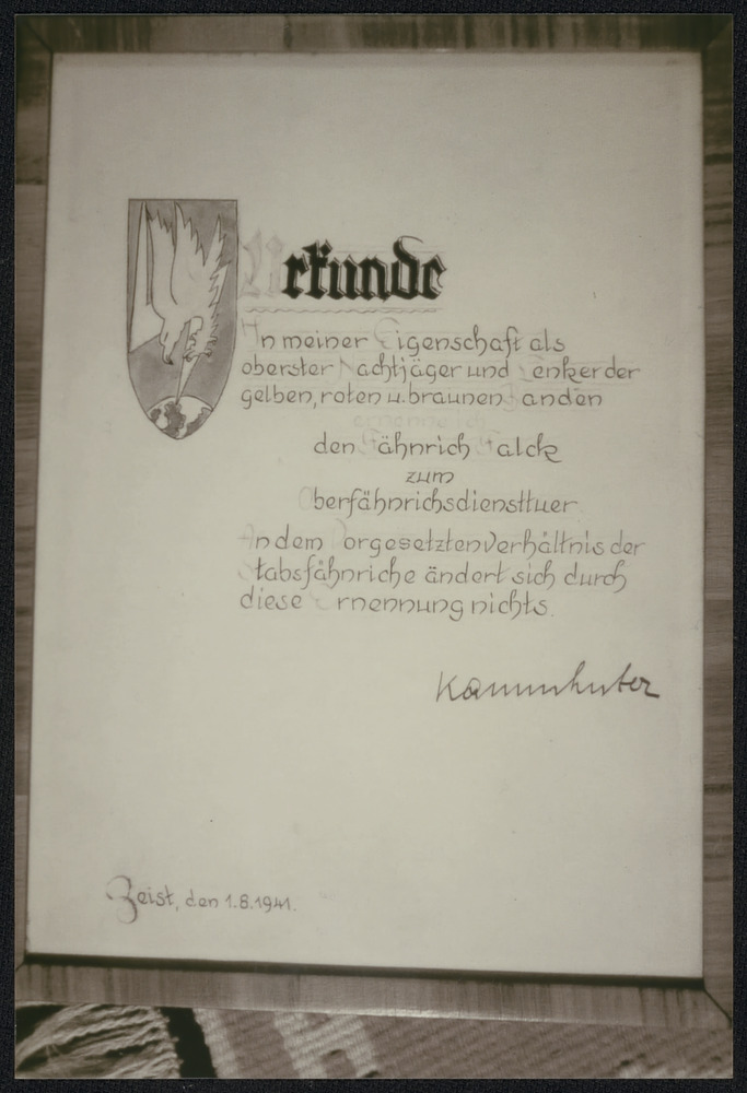 Oorkonde met nachtjager embleem voor Fähnrich Falck. Getekend door Kammhuber, Zeist, 1.8.1941.