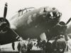 Foto van Boeing B-17 Flying Fortress bommenwerper. In het luik naar de cockpit staat een ladder waardoor de bemanning in het vliegtuig klom. Op de voorgrond rechts vier toeschouwers met de handen op de rug. Meerder personen in overall onder het vliegtuig.