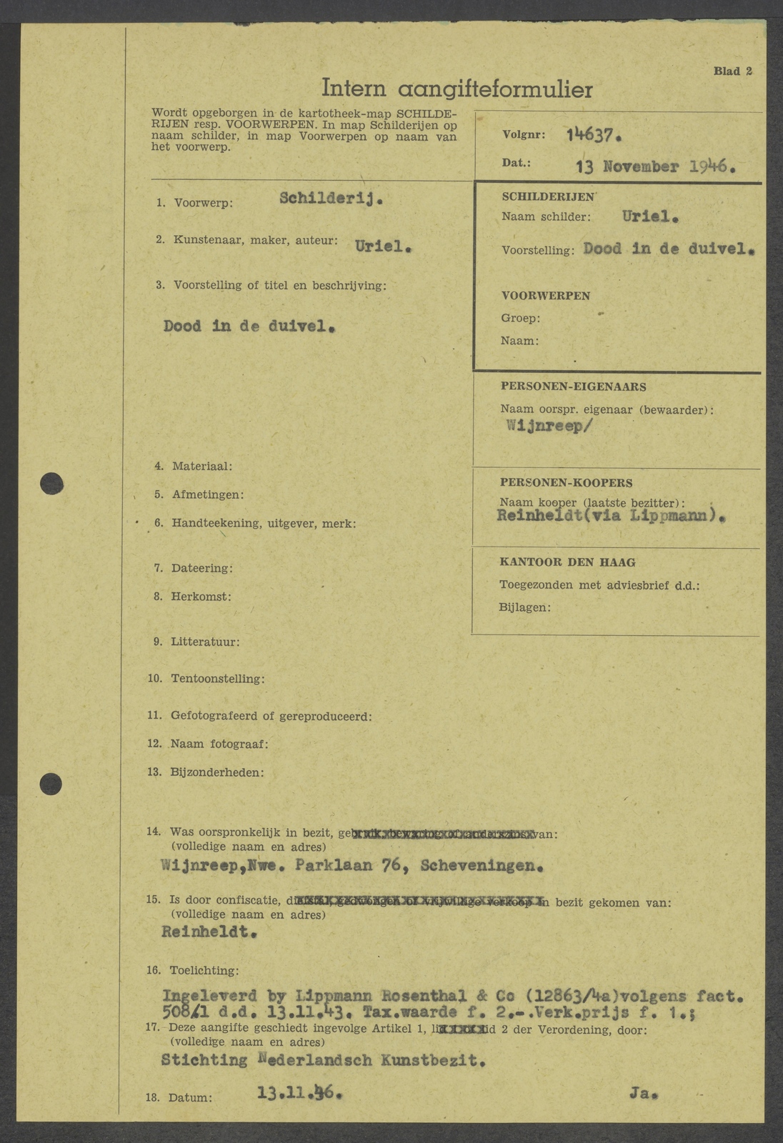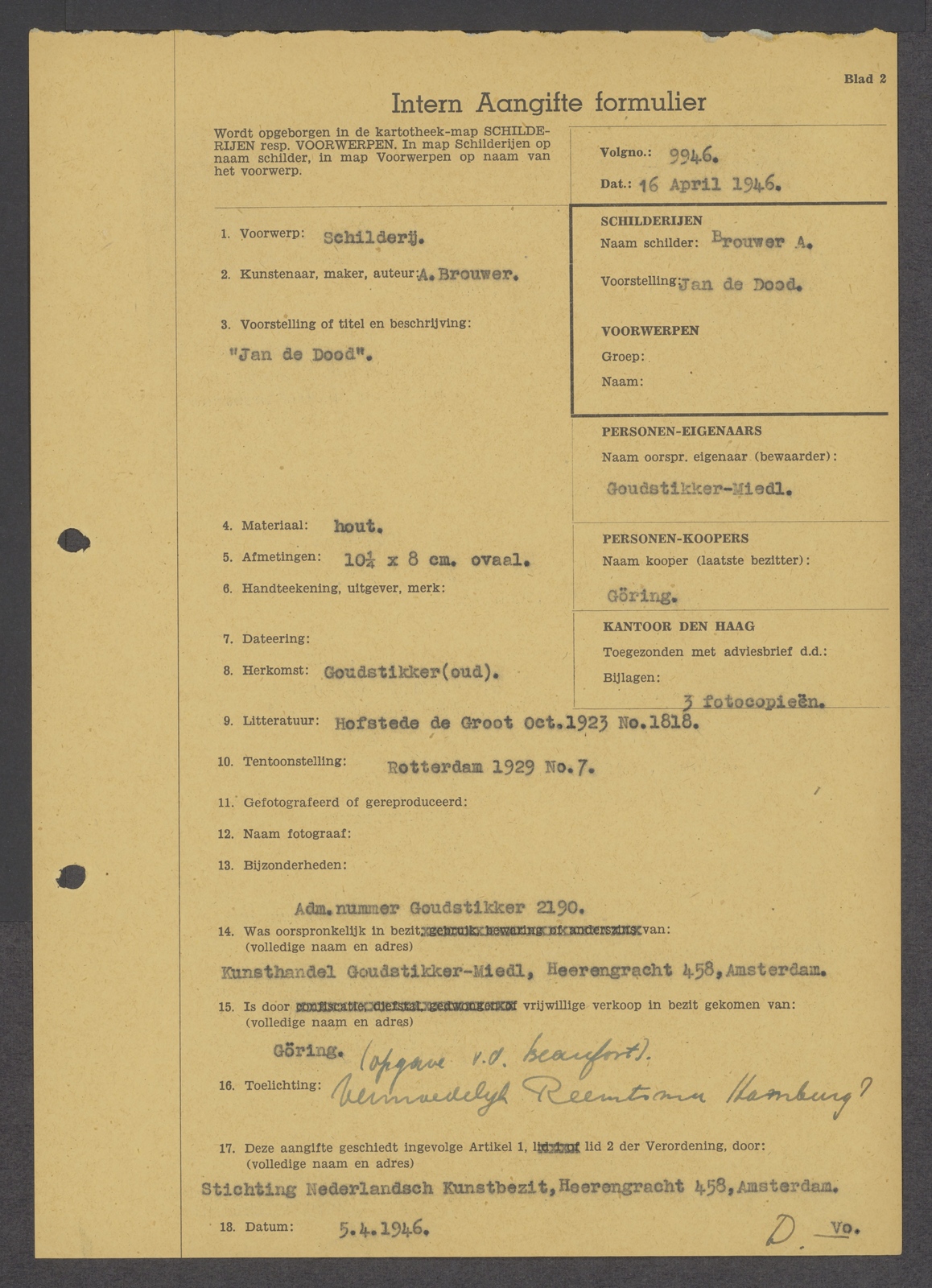 Aangifteformulier - Aangiftedatum: 1946-04-16 - Aangiftenaam: Stichting Nederlandsch Kunstbezit - Aangiftenummer: 9946 - Aangifteplaats: Amsterdam - Status: vrijwillige verkoop