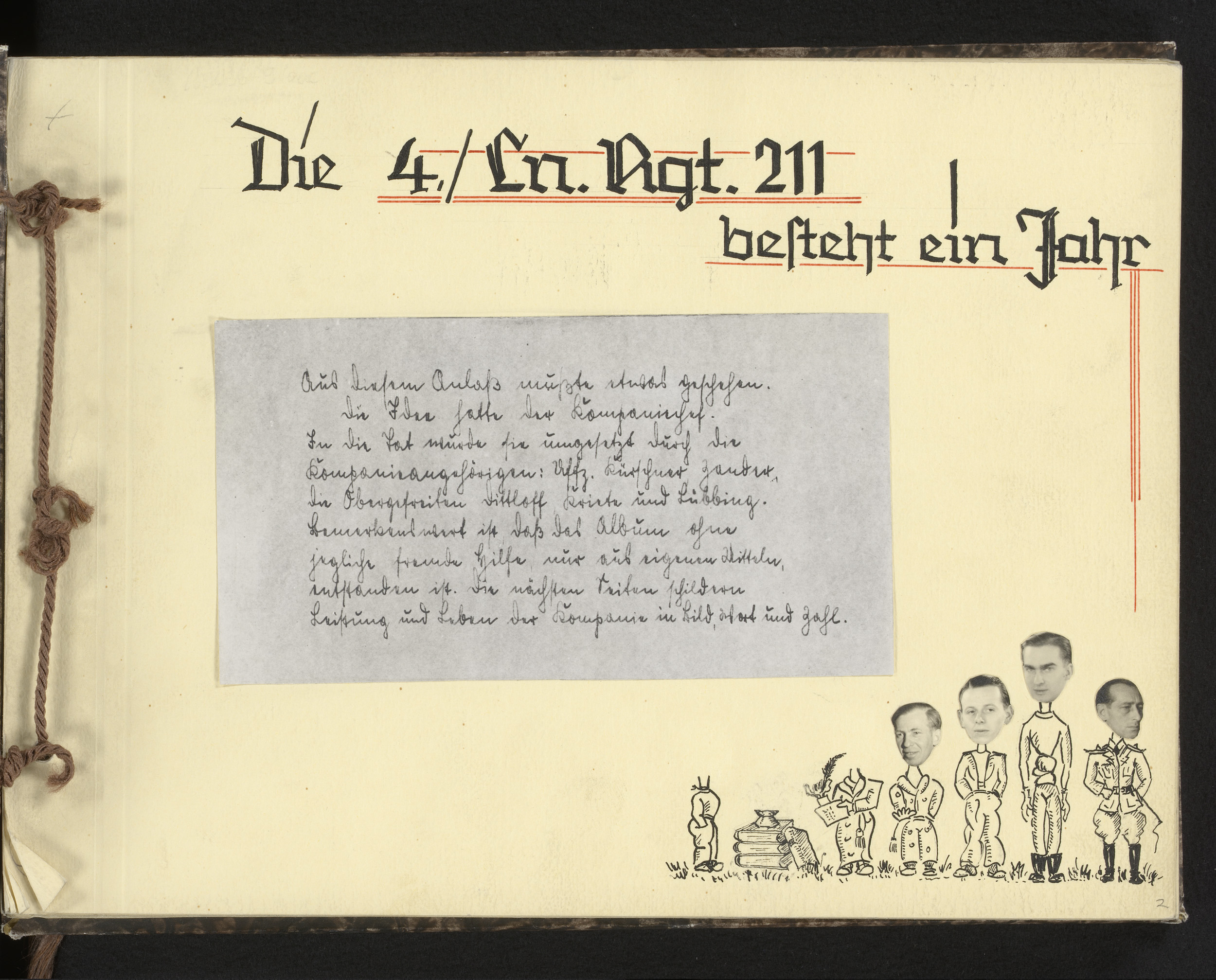 Albumblad met titelpagina. Onder de titel een ingeplakte foto van een tekst met rechtsonder getekende militairen met opgeplakte gefotografeerde en uitgeknipte hoofden (twee ontbreken). ONderdeel van het fotoalbum van de Luftnachrichten-Regiment 211,1942-1943.