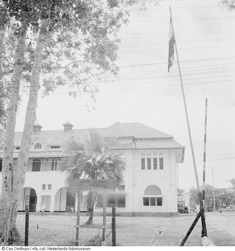 Netherlands Indies - Java, Jakarta (Batavia), Rijswijkstraat. After the taking over of a building formerly occupied by Indonesian nationalists, Indonesians are Interrogated and placed under guard by members of the Dutch forces. Clashes between Dutch forces and Indonesian nationalists causes a state of unrest and confusion in many parts of Java. NI 972 Op 16 september 1945 was de Nederlandse kruiser ...