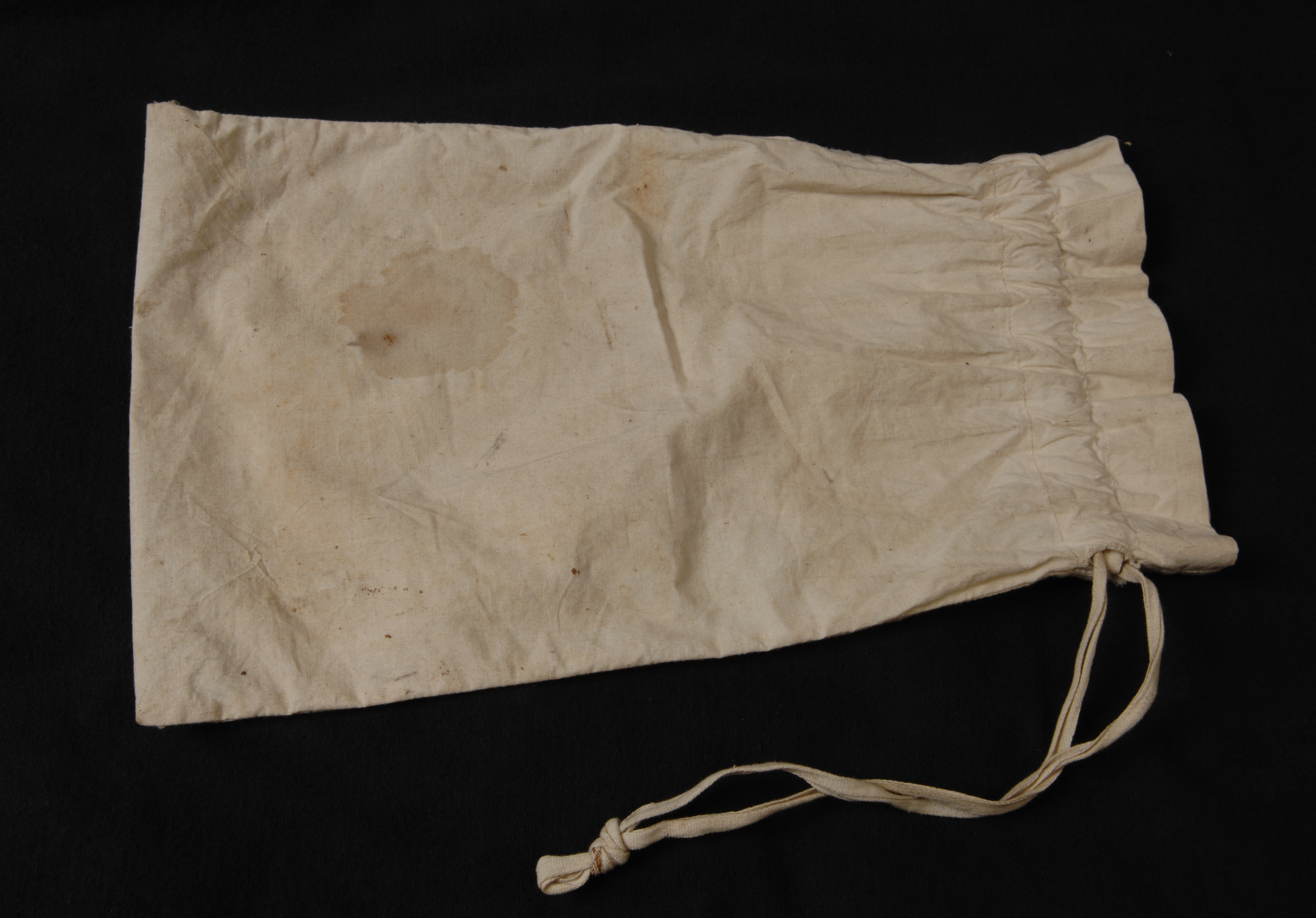 Linnen zakje Rode Kruis met welkomstpakketje repatrianten, van wit linnen zonder merken en met linnen treksluitkoordje