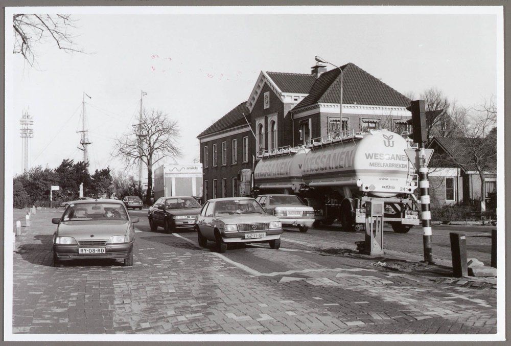 Wormerveer. Stationsstraat. Hier stond het Gemeentehuis van Wormerveer, het is verbrand en afgebroken, herbouwd en in gebruik genomen als Sociëteit "Het Rinus Hille Centrum". Na sluiting Sociëteit werd het pand in gebruik genomen als Politiebureau. Gezicht op de Zaanweg met het Verzetsmonument Vrouwe Justitia en de PTT-toren, deze staat in Wormer.