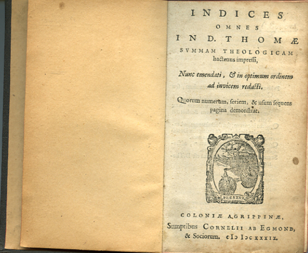 Dit boekje, in het Latijn, is een heruitgave gebaseerd op een uitgave van Cornelius ab Egmond in Keulen. De volledige titel luidt 'Indices omnes ind. Thomae summam Theologicam Hactenus Impressi: Nunc Emendati, & in Optimum Ordinem Ad Invicem Redacti Ouorum numertum, feriem, usumsequens pagina demonstrat Coloniae Agrippinae sumptibus Cornelii ab Egmond. Het werk (Hoofdzaak van de Theologie’) is geschreven ...